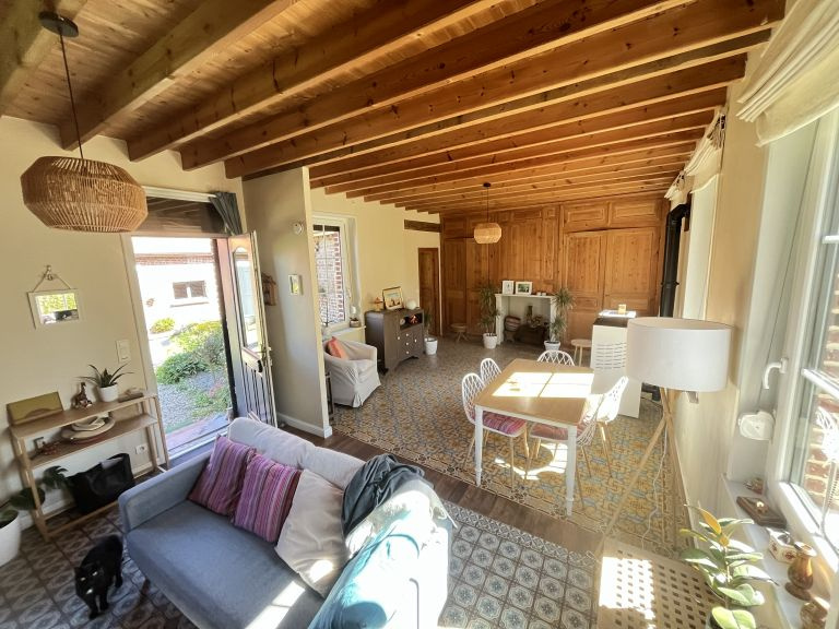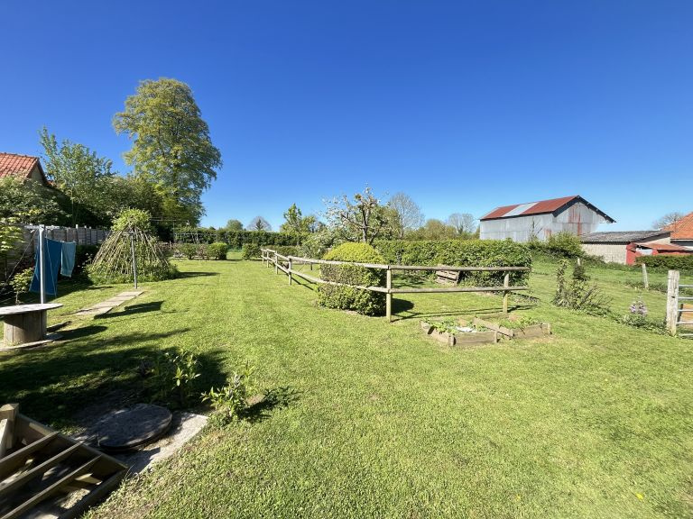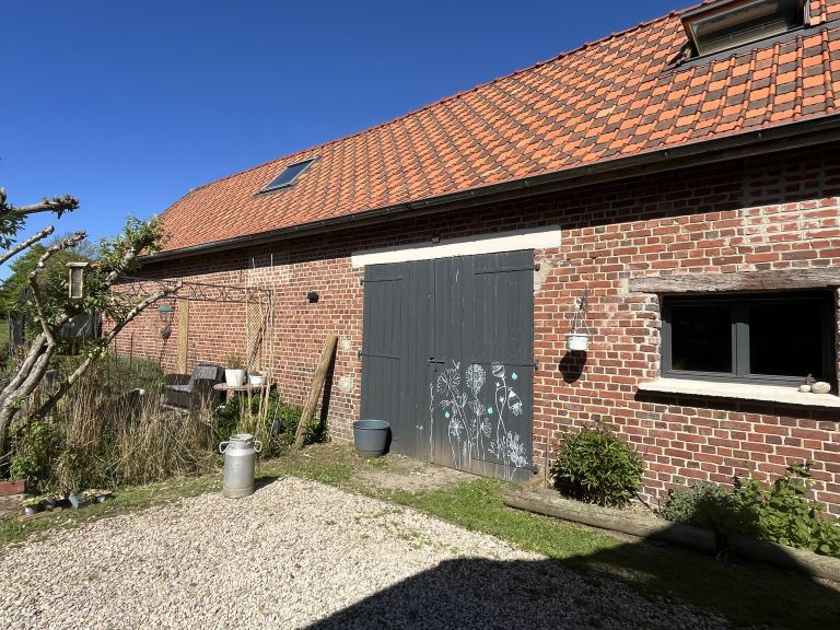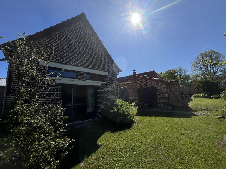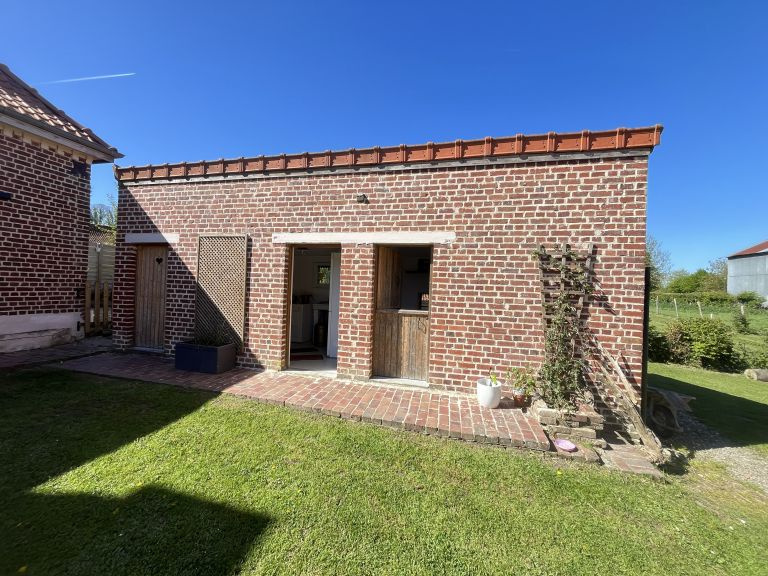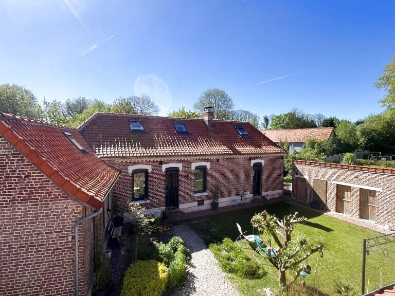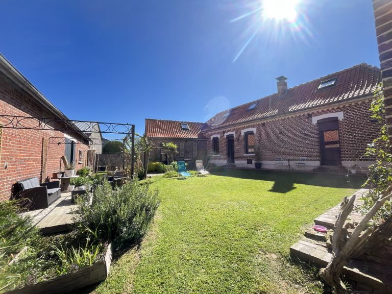 Réf. 4500 – Fermette de charme avec dépendances Située dans un petit hameau calme, à proximité de Saint-Pol-sur-Ternoise, cette fermette en briques en très bon état offre un cadre verdoyant et plein de caractère. Elle se compose d’un séjour double chaleureux avec poêle à pellets, insert, poutres apparentes et carrelages anciens, d’une cuisine équipée avec îlot central, d’un bureau traversant, d’un cellier et d’une mezzanine. À l’étage : palier desservant 2 belles chambres mansardées. Cave. Anciennes étables aménagées comprenant une chambre, un WC et une buanderie. Côté dépendances : Grange d’environ 100 m² avec dalle béton, dont une pièce aménagée avec SPA et vue sur le jardin Hangar de 120 m² avec dalle béton (hauteur 4,20 m) Le tout sur un beau terrain arboré de 1 753 m², dans un environnement calme et agréable. Double vitrage – assainissement conforme. Idéal pour les amoureux de la campagne et des biens de caractère !